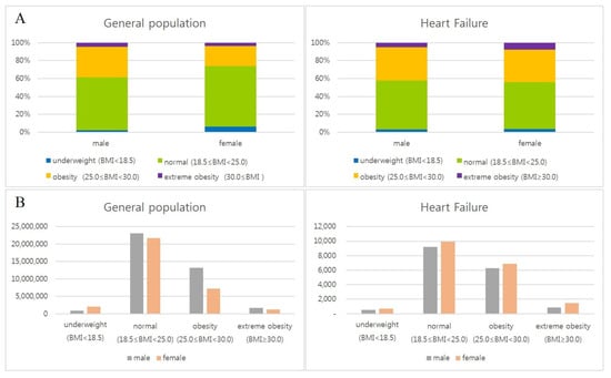 The proportion of obese people with a BMI over 25 kg/m2 in HF was 42.3 and 44.2% in men and women, respectively, and it was also higher than that of the general health check-up population from 2010 to 2021 (38.5 and 26.2% in men and women, respectively) (Table 1, Figure 2A). The incidence of HF is higher in women across all BMI subgroups compared to the general population (Table 1, Figure 2B) [].