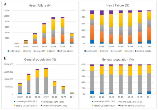 Distribution of BMI subgroups by age in heart failure. Analysis by age in heart failure patients (A) and general health check-up population (B). The combined frequency of obesity and extreme obesity groups was the highest in those in their 60s (4561), followed by those in their 70s (3719) and 50s (3658), respectively, in the HF group. However, in the same age group, the proportion of obesity and extreme obesity groups was the highest in their 40s (50.4%), followed by those in their 50s (48.4%) and 60s (47.9%), respectively (A). Age groups with high proportion of obesity were similar to the health check-up population (40s–60s of HF group vs. 30s–70s of check-up group) (B). General health check-up data of national health insurance service from the Korean Statistical Information Service (2010–2021).