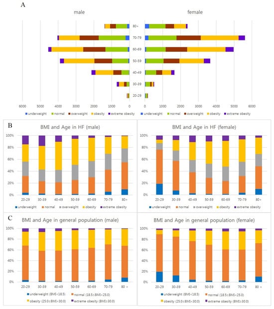 Distribution of BMI subgroups by age and sex in heart failure (2006–2015). Analysis by age and sex in heart failure patients (A,B) and general health check-up population (C). In the same age group, the proportion of obesity was the highest in men in their 40s (57.7%) and 30s (57.3%), and women in their 60s (52.2%) in heart failure. The proportion of the obese group has declined with age in older people, and on the contrary, that of normal and underweight groups has gradually increased in the same age group in both sexes (B). The pattern of the proportion of obesity by age and sex was similar to that of the health check-up group of the general population (C). General health check-up data of national health insurance service from Korean Statistical Information Service (2010–2021).