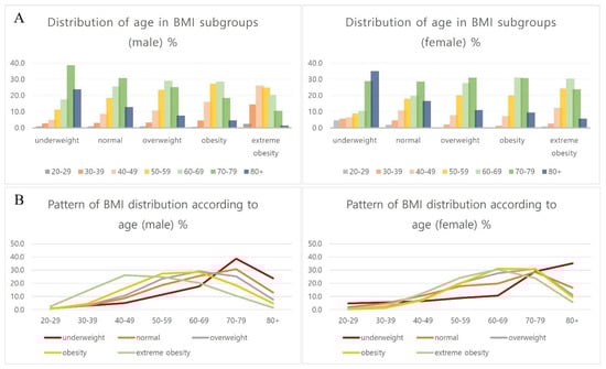 In the same age group, the proportion of extreme obesity and obesity was the highest among men in their 40s (57.7%) and 30s (57.3%) and women in their 60s (52.2%). The proportion of extreme obesity and obesity has declined with age in older people, and on the contrary, that of normal and underweight groups has gradually increased in the same age group in both sexes. The pattern of proportion of obesity by age and sex was similar to that of the health check-up group of the general population (Table 3, Figure 4) [].