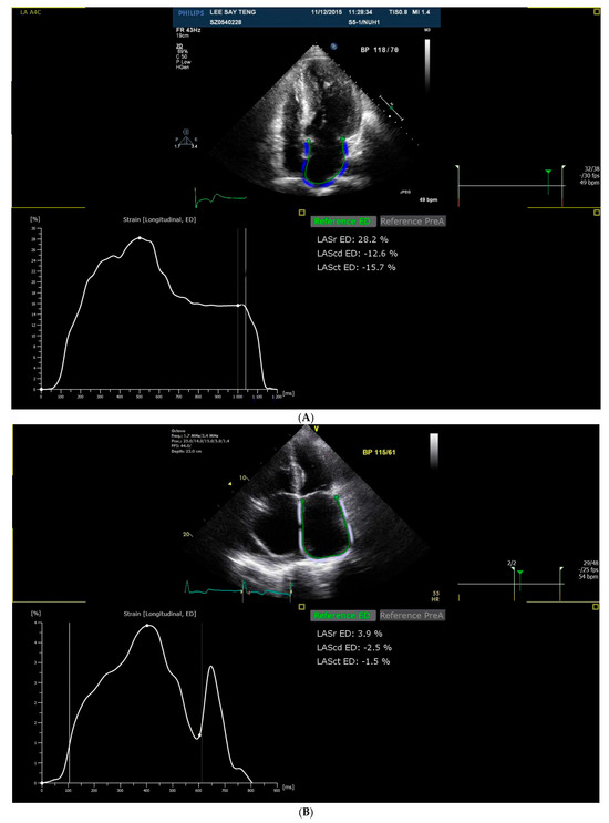 Strain analysis was performed post-hoc based on the non-foreshortened echocardiographic images in the apical 4-, 3-, and 2-chamber views using a commercial software, TomTec-Arena version 4.6 (TOMTEC Imaging Systems GmbH, Munich, Germany). This allowed for the generation of reservoir (LASr), conduit (LAScd), and contraction strain (LASct). The LA contours were initially automatically traced using the TomTec software and manually checked for accuracy and adjusted accordingly. The patients were classified as normal or abnormal strain based on accepted reference values from the literature, where cut-offs of 23%, 12%, and 5% were adopted for LASr, LAScd, and LASct strain, respectively [17,18]. Figure 1A,B demonstrate the measurement of LA strain in patients with good LA strain and poor LA strain, respectively.