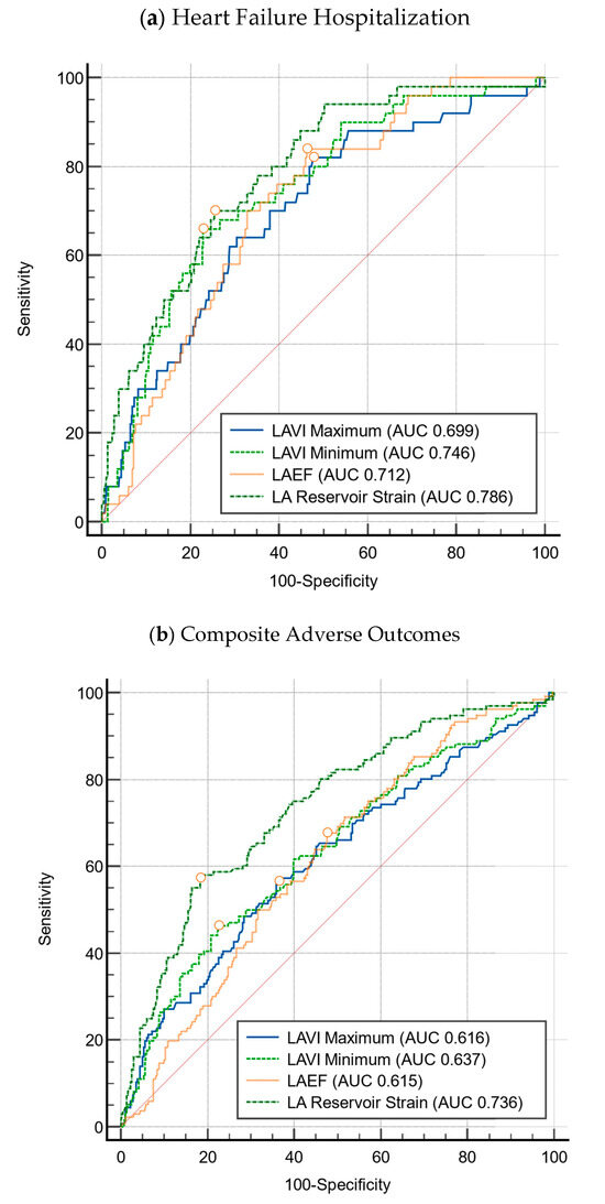 Heart failure event-free survival was 81.8% for patients with abnormal LA reservoir strain compared to 98.3% for patients with normal LA reservoir strain (p < 0.001). This relationship was also found in terms of composite adverse outcomes, wherein composite event-free survival was 55.2% for patients with abnormal LA reservoir strain compared to 82.4% for patients with normal LA reservoir strain (p < 0.001). The predictive power of the LA strain parameters, LASr, LAScd, and LASct, were also corroborated by the ROC curve analysis for which the AUC was 0.786, 0.794, and 0.692, respectively, as shown in Figure 3 and Figure A1.