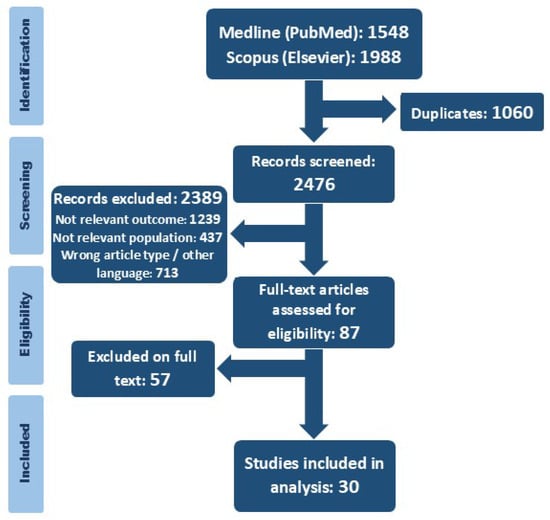 The initial search resulted in 3536 publications in Medline (PubMed) and Scopus (Elsevier). After the removal of duplicates, 2476 articles were selected for titles and abstract screening (Figure 1). In the first step, 2389 articles were excluded, and 87 studies underwent full-text assessment. Finally, our systematic review comprised 30 publications.