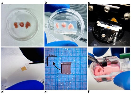 Established protocols were adopted to produce LMSs [3,5,9,11]. In brief, the surgically obtained explanted tissue (Figure 1a) was trimmed into 1 × 1 × 1 cm tissue blocks and anchored with agarose to ensure stabilization on the vibratome stage (Figure 1b). The vibratome (VT1200 S, Leica BioSystems, Nussloch, Germany) was used to meticulously section the tissue to a thickness of 300 µm, using a speed of 0.07 mm/s and a vibration amplitude of 1.3 mm (Figure 1c). Once cut, slices remained in a cold-water bath at 4 °C until further preparation.