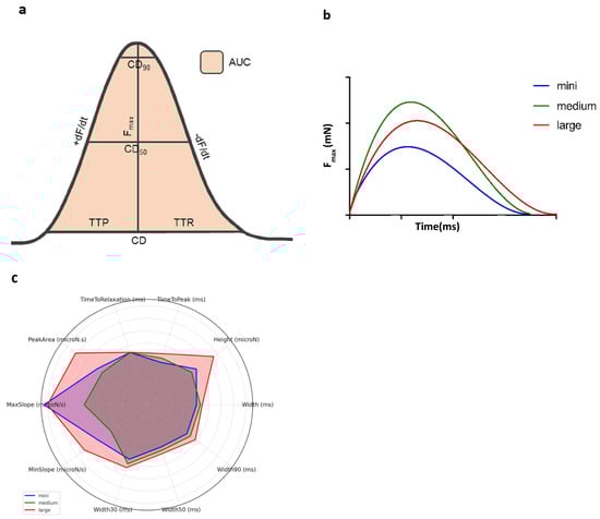 Baseline biomechanical profiles of mini-, medium and large LMSs. (a) Bell curve with the biomechanical characteristics of contractility: AUC = area under the curve. CD = total contraction duration. Fmax = maximum contraction force. TTP = time-to-peak. TTR = time-to-relaxation. +dF/dt = steepest positive slope. −dF/dt = steepest negative slope. (b) Three contraction curves of nonlinear regression mean values for large, medium, and mini-LMSs (the colors represent large (red), medium (green), and mini-LMSs (blue)). (c) Radar plot of median values, specified by LMS size category (the colors represent the same categories as in (b)).