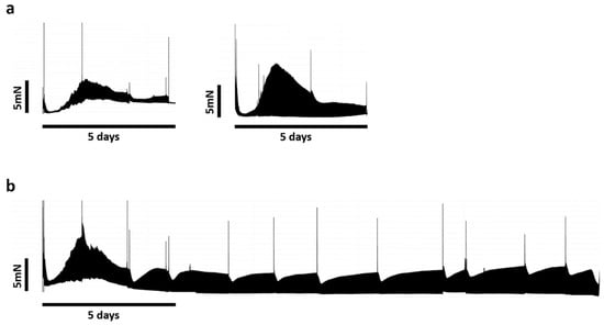 Continuous contractility recording. Positive spikes of contractility were produced by isoprenaline administration and corresponded to medium exchange intervals (36–48 h). (a) Contractility from mini-LMSs from two different patients. (b) Contractility from large-LMSs from first patient.