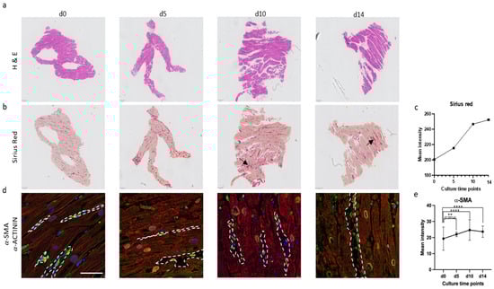 Immunohistochemical analysis targeting α-SMA and α-ACTININ was performed to further assess myofibroblast activation as a key indicator of fibrosis and sarcomere organization, respectively. The baseline slice exhibited a minimal number of α-SMA-positive cells and striated organization of α-ACTININ compared to d5, d10, and d14, indicating normal levels of myofibroblasts amidst cardiac cells containing a proper alignment of sarcomeric units in d0 samples. Conversely, slices cultured up to d5, d10, and d14 displayed a significant upregulation of α-SMA and disorganized α-ACTININ signals, suggesting disrupted sarcomeric architecture and an increased presence of myofibroblasts (Figure 4d,e; highlighted in white).