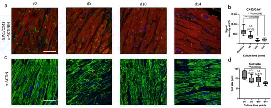 To further asses the integrity of intercalated discs and the structural organization of Z-discs, immunofluorescent staining for CX43 and α-ACTIN was performed, respectively. There was a significant reduction in intercalated disc signal intensity after day 10 (Figure 5a,b). At baseline, a regular and striated pattern of α-ACTIN was observed, reflecting the proper alignment of sarcomeric units. After day 5, α-ACTIN stainings exhibited a disorganized and irregular pattern, indicating structural abnormalities in the sarcomeric organization with consequential significant reduction in cell size as compared between baseline and day 14 (Figure 5c,d).