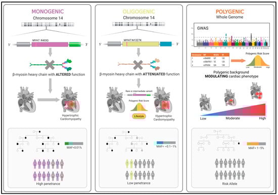 Figure 1. The genetic continuum of cardiomyopathies: From monogenic to polygenic inheritance. This figure illustrates the genetic spectrum of cardiomyopathies, from rare, high-impact to common polygenic variants. The monogenic model (left) involves rare pathogenic variants with high penetrance and autosomal dominant inheritance (e.g., MYH7:p.R403Q). These variants (minor allele frequency [MAF] < 0.01%) directly alter protein structure and are typically sufficient to cause disease. The oligogenic model (center) includes intermediate-effect variants (e.g., MYH7:p.N1327K), which interact with other genetic and environmental factors. These variants have moderate frequency (MAF ~0.1–1%), incomplete penetrance, and variable expressivity, often requiring additional modifiers for disease manifestation. The polygenic model (right) reflects the cumulative contribution of numerous common variants (MAF > 1%) with small individual effects. These variants act additively and probabilistically, are quantified using polygenic risk scores (PRS), and follow a complex, non-Mendelian inheritance pattern. While each variant confers minimal risk, their combined burden can stratify individuals by susceptibility. PRS may influence disease expressivity in monogenic cases and help explain phenotypes in remainder individuals. Although examples are drawn from HCM, this continuum applies broadly to other forms such as DCM and ACM, highlighting a shift toward an integrated understanding of genetic risk.