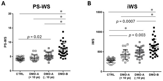 Figure 2B,C). Both PS-WS and iWS are significantly higher in DMD-B compared with DMD-A (<10 yo) and DMD-A (≥10 yo) (