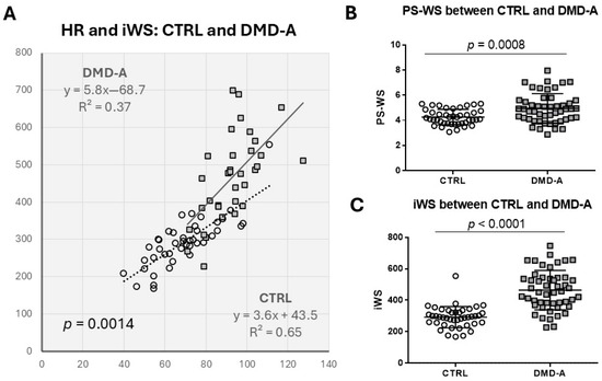 As iWS is defined as a product of PS-WS and HR, we investigated whether the increase of iWS in DMD patients is predominantly attributed to the increase in HR. In the following analysis, we combined two DMD-A groups into one to assess the difference between CTRL and DMD-A (=DMD with normal LV systolic function), as there is no notable difference in PS-WS or iWS between the two DMD-A groups. HR and iWS show a very good positive linear correlation in both CTRL and DMD-A, more in CTRL (R = 0.81) than in DMD-A (R = 0.61) (