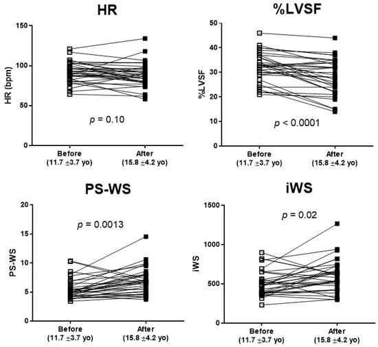 Figure 3). Over this time period, %LVSF was significantly reduced from 32.3 ± 6.0% to 28.3 ± 7.3%, whereas PS-WS and WSI significantly increased during this time (5.55 ± 1.76 to 6.86 ± 2.27 and 507 ± 163 to 600 ± 205, respectively). HR showed no significant change during this period.