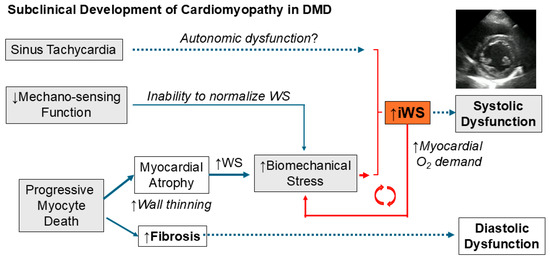 33]. The absence of dystrophin may perturb an ordinary compensatory response to biomechanical stress. DMD heart may be uniquely characterized by an inability to normalize WS with progressive myocyte loss and subsequent myocardial fibrosis.
