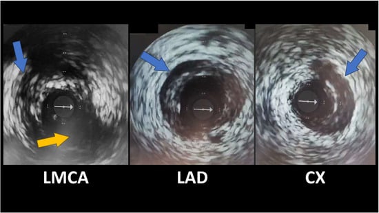 IVUS revealing spontaneous coronary artery dissections (blue arrows); Cx emergence from LMCA (yellow arrow). The white arrow indicates the IVUS guidewire.