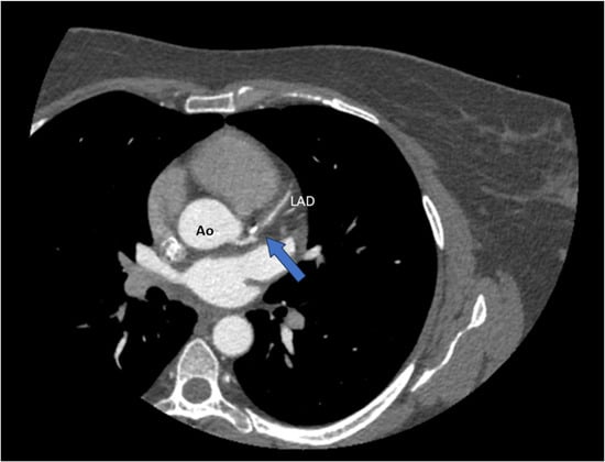 CT coronary angiography (CTCA) revealing a spontaneous dissection of the left anterior descending artery (LAD) (blue arrow). Ao = aorta.