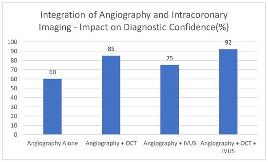 This graph [Figure 4] demonstrates exemplary data, which shows that OCT and IVUS, used in combination with conventional angiography, can help increase diagnostic confidence. This number is conceptual. Since angiography primarily provides luminal information, it is associated with the lowest illustrative percentage of cases diagnosed with high confidence [60%]. OCT, with its detailed visualization of the vessel wall and plaque features, is shown to increase diagnostic confidence to 85%. Combining IVUS into imaging procedures further increases illustrative confidence [75%], due to its deeper penetration and ability to provide information about vessel remodeling, despite its lower resolution compared to OCT. The descriptive confidence in providing the diagnosis rises to 92 per cent when angiography is accompanied by both the OCT and IVUS, indicative of the fact that a combination of the three can yield the most comprehensive overview of the coronary artery disease.