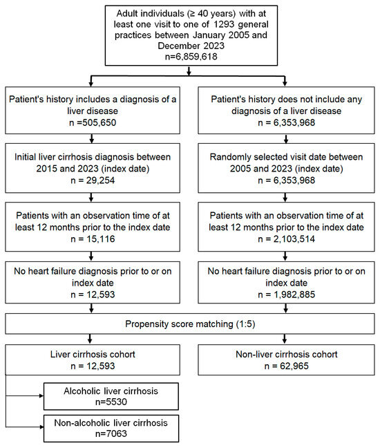 The study population included adults aged ≥ 40 years with a first-time diagnosis of LC (ICD-10 codes: K70.3, K74.3, K74.4, K74.5, K74.6), recorded in 1293 general practices in Germany between January 2005 and December 2023 (index date; see Figure 1). As the database ended in December 2024 and to ensure a minimum of 12 months of follow-up, we defined the index date up to the end of 2023 for patients whose index date occurred that year.