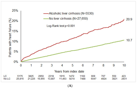 The 10-year cumulative incidence of heart failure (HF) was assessed using Kaplan–Meier survival curves, with differences between groups evaluated using the log-rank test. To evaluate the association between LC and incident HF, multivariable Cox proportional hazards models were used. Patients with LC were matched to controls without liver disease using 5:1 nearest-neighbor propensity score matching without replacement and with a caliper of 0.1 standard deviations of the logit of the propensity score. The propensity score was estimated using logistic regression and included the following baseline covariates documented within 12 months prior to or on the index date: age, sex, index year, average annual consultation frequency, obesity (ICD-10: E66), diabetes mellitus (E10–E14), hypertension (I10), dyslipidemia (E78), ischemic heart disease (I20–I25), and chronic obstructive pulmonary disease (COPD; J44). Matching was conducted separately for patients with alcoholic LC and non-alcoholic LC. In the non-LC cohort, the index date was assigned as a randomly selected visit during the study period; the randomization process was stratified to align with the distribution of index years in the LC group to minimize temporal bias. The Cox models were adjusted for medications prescribed within 12 months prior to or on the index date, including diuretics, beta-blockers, calcium-channel blockers, angiotensin-converting enzyme (ACE) inhibitors, angiotensin II receptor blockers (ARBs), lipid-lowering drugs, and sodium-glucose co-transporter 2 (SGLT2) inhibitors. Subgroup analyses were conducted stratified by sex and age categories (<60, 60–69, and ≥70 years). To account for multiple comparisons (six Cox models across different subgroups), we applied a conservative Bonferroni-adjusted threshold for statistical significance of p < 0.01. All analyses were conducted using SAS version 9.4 (SAS Institute, Cary, NC, USA).