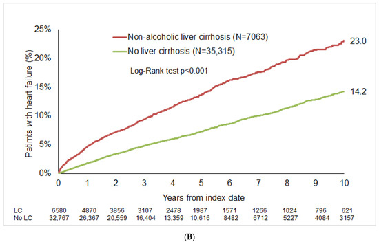 After up to 10 years of follow-up, HF was diagnosed in 20.9% of patients with alcoholic LC compared to 10.3% of the matched cohort (p < 0.001; Figure 2A). In the non-alcoholic LC group, the 10-year cumulative incidence of HF was 23.0%, compared to 14.2% in matched cohort (Figure 2B).