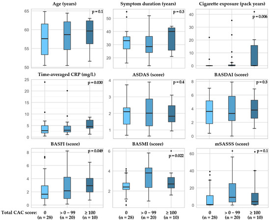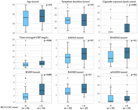 - Navarini, L.; Currado, D.; Marino, A.; Di Donato, S.; Biaggi, A.; Caso, F.; Costa, L.; Tasso, M.; Ruscitti, P.; Pavlych, V.; et al. Persistence of C-reactive protein increased levels and high disease activity are predictors of cardiovascular disease in patients with axial spondyloarthritis. Sci. Rep. 2022, 12, 7498. [Google Scholar] [CrossRef] [PubMed]