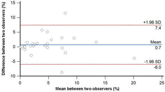 Quantitative LGE analysis was performed by two independent observers, showing good agreement between the values obtained (Figure 1). The ICC between the two independent observers was 0.86 (95% CI 0.70–0.93).