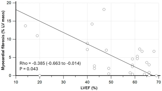 The burden of myocardial fibrosis, as assessed by quantitative LGE (expressed as % of LV mass), was inversely correlated to the LVEF in sepsis survivors (Spearman’s Rho = -0.385; p = 0.043; Figure 2).