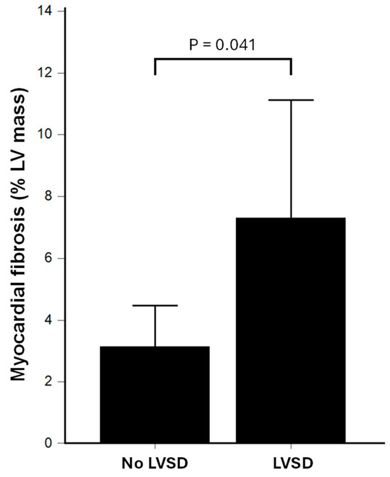 Patients with LVSD (LVEF < 50%; n = 12), had significantly greater myocardial fibrosis burden than patients with preserved LV systolic function (LVEF ≥ 50%; n = 16), as assessed by quantitative LGE (7.3 ± 6.0% vs. 3.1 ± 2.5%; p = 0.041; Figure 3). Similarly, patients with positive LGE had significantly lower LVEF as compared to patients with negative LGE (48 ± 17% vs. 60 ± 7%; p = 0.017).