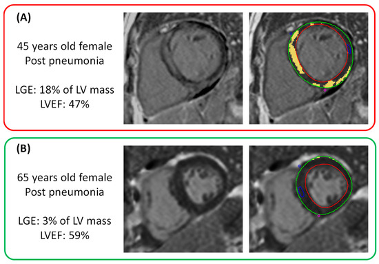 Illustrative examples of sepsis survivors with (Panel A) and without (Panel B) significant late gadolinium enhancement (LGE) on visual and quantitative analysis. Enhanced myocardium (yellow) is highlighted as regions with signal intensity 5 standard deviations above the mean signal intensity of remote myocardium (blue region of interest). LVEF: left ventricular ejection fraction.