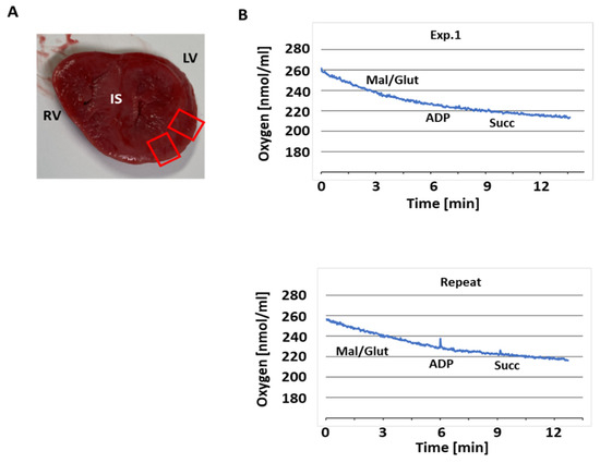 Freshly isolated heart mitochondria (≈115 µg protein) were resuspended in respiration buffer and stimulated with malate/ glutamate (basal respiration, V0), and followed by the addition of ADP (maximal respiration, Vmax, Figure 1B). No oxidative activity was observed. To exclude the possibility of an inactive Cx I [21,22], 10 mM succinate was added to stimulate Cx II mediated respiration. However, while oxygen in the measuring vessel decreased in two trials, no response to the substrates (malate/glutamate and succinate) or ADP was detectable. This indicated severely compromised mitochondria, as we have previously measured respiratory activity in similar samples [23].