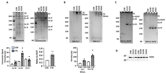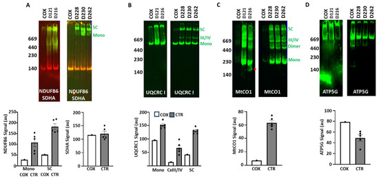 Immunoblotting after clear native electrophoresis confirms the absence of Cx I and Cx IV. (A) Detection and analysis of Cx I subunit NDUFB6 expression (in green) confirms absence of monomeric Cx I and almost no supercomplexes in the COXPD8 patient, while the detection of Cx II subunit SDHA (in red) was similar in all samples. (B) The monomer of Cx III was detected in the COXPD8 patient, but supercomplexes were not when labeled for UQCRC1). (C) Faint detection of Cx IV subunit MtCO1 in monomers and supercomplexes in COXPD8 patient compared to controls. An additional signal for MtCO1 at ≈200 kD in patient D216 is indicated by *. (D) Detection of the Cx V subunit ATP5G was not affected by COXPD8. 20 µg protein was loaded in each lane of these 4–10% native gels. VDAC detection for loading control is presented in Figure 2D. COX: COXPD8 patient, CTR: control patients, mono: monomer, SC: supercomplexes.