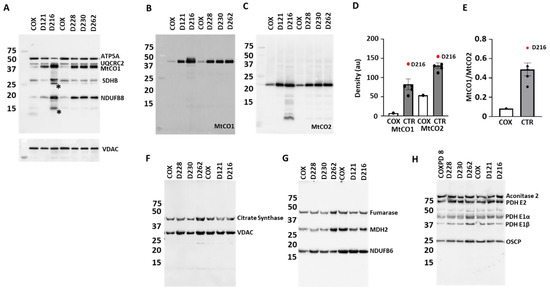 SDS electrophoresis of mitochondria from COXPD8 and control hearts. (A): Immunoblotting shows the expression of a subunit of every ETC complex relative to VDAC expression. (B): Expression of the Cx IV subunits MtCO1 and MtCO2 in COXPD8 (COX) and control (CTR) patients. (C–E): Expression of Cx IV subunits MtCO1 and MtCO2 was lowest in COXPD8 patient and highest in patient D216 (●). (F–H): Expression of various TCA cycle enzymes was not affected in the COXPD8 patient. 5 µg protein were separated per lane on a 15% SDS gel. COX: COXPD8 patient, CTR: control patients, MDH2: malate dehydrogenase 2; PDH: pyruvate dehydrogenase; OSCP: oligomycin sensitivity conferring protein.