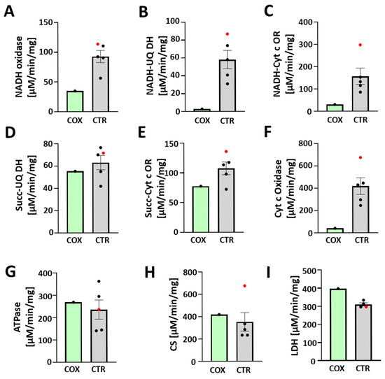 Enzymatic activity of ETC complexes, citrate synthase, and lactate dehydrogenase. Enzymatic activity of ETC Cx I-V (A–G), citrate synthase (H), and lactate dehydrogenase (I). Enzymatic activities of patient D216 are highlighted in red (●). All activities are presented in µM/min/mg. NADH-UQ DH: NADH-ubiquinone dehydrogenase; NADH-Cyt c OR: NADH-cytochrome c oxidoreductase; Succ-UQ DH: succinate-ubiquinone dehydrogenase; Succ-Cyt c OR: succinate-cytochrome c oxidoreductase; Cyt c Oxidase: cytochrome c oxidase; ATPase: oligomycin-sensitive ATPase activity of Cx V; CS citrate synthase; LDH lactate dehydrogenase.