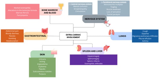 EM may affect middle-aged adults of both sexes equally []. According to the different possible etiologies, the clinical onset can range from subtle symptoms to acute heart failure (AHF) and, in severe cases, life-threatening fulminant myocarditis (FM) []; therefore, a high index of suspicion is crucial for timely and accurate diagnosis []. Patients could experience prodromal symptoms, such as flu-like illness, gastrointestinal issues, sore throat or respiratory infections; these symptoms can precede the acute phase by days or even weeks []. Fever is common (65%) [], while dyspnea (19–49%) is less frequent and syncope (6%) is atypical []. Despite these variations, chest pain remains the most frequent symptom, occurring in 85–95% of cases []. In many cases, prodromal symptoms fail to alert patients, who often go to the emergency room only when AHF becomes evident—typically with dyspnea, fatigue and peripheral edema—or, in rarer cases of FM, hemodynamic instability develops in the context of cardiogenic shock (CS). Notably, due to the inflammatory nature of EM, patients are at a heightened risk for intracavitary thrombus and thromboembolic complications such as stroke or pulmonary embolism [,,]. Moreover, as a systemic condition, extracardiac involvement is common (Figure 1).