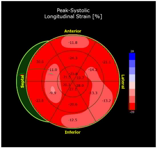 Bull’s-eye plot of GLS analysis shows a “reverse apical sparing” pattern, with lower longitudinal shortening values in some mid-basal segments (light red) and preserved values in apical segments (red). In clinical practice, values less negative than -16% are considered reduced [].