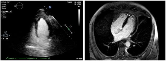 Global longitudinal speckle (GLS), assessed by speckle tracking echocardiography, is useful for assessing myocardial deformation and identifying early systolic dysfunction, even when standard LVEF is still preserved []. In the chronic phase, a pathological pattern predominantly involving the apex, known as “reverse apical sparing”, may be observed [] (Figure 3). This can also be observed in hypertrophic cardiomyopathy; GLS values are typically preserved in this setting []. Left ventricular mechanical dispersion (LVMD) is an emerging parameter that strongly correlates with the risk of ventricular arrhythmias and overall prognosis. It may outperform both GLS and LVEF in terms of predictive value. However, it has not yet been studied in the context of AM and further research is required to define clinically meaningful cutoff values [,,]. Regarding diastolic dysfunction, elevated filling pressures may predict progression toward restrictive cardiomyopathy [,,]. For the detection of intracavitary thrombi, particularly at the LV apex, specific intravenous ultrasound contrast agents can be useful. These agents are also beneficial for better characterization of ventricular function and for differential diagnosis with apical hypertrophic cardiomyopathy [,]. Regurgitation of the atrioventricular valves is a common finding, likely secondary to inflammatory damage and altered cardiac hemodynamics. Specifically, mitral regurgitation derives from chronic restriction of posterior leaflet motion [,] and tricuspid regurgitation may result from direct inflammatory injury or be a consequence of pressure overload due to left-sided valvular disease [,]. Severe mitral stenosis secondary to EGPA has also been reported, with a positive response to pharmacological treatment []. In case of persistent doubts regarding valvular anatomy and intracavitary thrombus, transesophageal echocardiography can be helpful [,].
