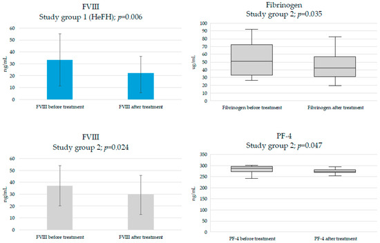 p = 0.002) and fibrinogen, but only in study group 2 (from 51.4 (33.2–72.7) to 42.6 (31.3–57.2) (µg/mL),
