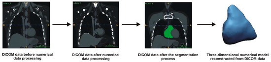 The first step in developing the numerical RVOT model was a data-filtering process to remove noise from the Digital Imaging and Communications in Medicine (DICOM) images. Next, the spatial resolution of the DICOM images was enhanced using the Lanczos interpolation method [9,10]. This method involved determining additional pixels based on the intensity of neighboring pixels. By applying this interpolation process, we could accelerate the extraction of the anatomical structures while improving the accuracy of the geometry restoration, particularly by minimizing step artifacts in the DICOM images. After the interpolation, additional filtering was conducted to sharpen the boundaries between the anatomical structures and surrounding tissues. Following this, a segmentation process was performed, which involved extracting the anatomical structures from the entire volumetric data set using the global thresholding method [10]. A lower segmentation threshold of 50 on the Hounsfield scale was applied to delineate the contours of the segmented structure. To visualize the 3D model, a voxel-based method utilizing the Marching Cubes algorithm was used. The final output was a digital 3D model saved in a Stereolithography (STL) file [11]. Figure 1 illustrates a general schematic of the geometry reconstruction process.
