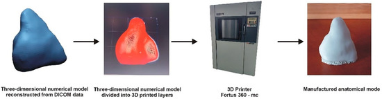 The model was manufactured using the FDM additive method, part of material extrusion technology [12,13]. Fused deposition modeling (FDM), also referred to as fused filament fabrication (FFF), is an additive manufacturing technique based on material extrusion. In this process, a thermoplastic filament is heated and precisely extruded through a nozzle, depositing material layer by layer along a programmed path to construct the final three-dimensional structure. A Fortus 360-mc printer from Stratasys was utilized for 3D printing the anatomical model. This printer features movable print heads and a worktable. The thermoplastic material is supplied to the print heads from cassettes, where it is melted and pumped into heated print tips. The numerically controlled machine alternately deposits the model and support material onto the worktable according to the generated layers, building the complete model layer by layer. Before starting the FDM printing process, the digital model is loaded into the Insight 7.0 software. The software allowed the model to be divided into layers and generated supports. A complete fill was applied to the entire model when subdividing the model into layers. For the parameter that defines the style of visible surfaces, the enhanced option was selected to achieve the best possible representation of the manufactured surface. The 3D-printed model was created using PC-10 material and T12 print heads (Stratasys, Ltd., Eden Prairie, MN, USA), maintaining a thickness of 0.178 mm. A general schematic illustrating the manufacturing process of the model using the FDM additive method is presented in Figure 2.