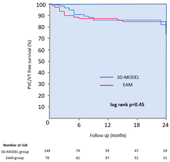 During a mean follow-up period of 14 ± 10 months, 82% of patients remained free from arrhythmia (87% in the 3D-MODEL group vs. 75% in the EAM group; log-rank p = 0.45) (Figure 4). A subgroup analysis revealed no significant differences in long-term efficacy between groups: in patients with PVCs, arrhythmia-free survival was 83% in the 3D-MODEL group vs. 70% in the EAM group (p = 0.90), and in patients with VT, it was 91% vs. 67%, respectively (p = 0.37). Three patients were lost to follow-up. A twenty-four-hour Holter ECG was performed for over 90% of patients during follow-up. Although Holter monitoring is considered the most important for assessing the post-ablation arrhythmia burden, it was not obtained from all patients due to the retrospective nature of the study. In selected patients, long-term procedural efficacy was assessed based on consistent clinical indicators—such as stable sinus rhythm documented in repeated 12-lead ECGs and complete resolution of symptoms—particularly when the arrhythmia had been previously frequent and clearly evident on every baseline ECG.