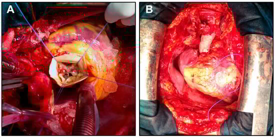 Intraoperative views during surgical correction of a PAV and ascending aortic aneurysm. (A) Intraoperative exposure of a PAV during aortic root replacement. The valve shows five distinct cusps with asymmetric morphology. Stay sutures are placed to retract the aortic wall and expose the valve anatomy. (B) Completion of the procedure following valve and ascending aorta replacement with a composite graft. The graft anastomosis and surrounding structures are shown in situ prior to chest closure.