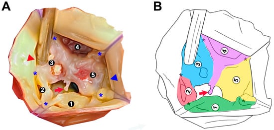 Morphological anatomy of a pentacuspid aortic valve (PAV): surgical and schematic views. (A) Intraoperative photograph demonstrating a severely dysmorphic PAV with five identifiable cusp regions labeled 1–5 (the same as Figure 1A but zoomed in and cropped). Note the irregular cusp sizes, variable commissural spacing, and presence of fused and rudimentary cusp tissue. Blue asterisks (*) denote commissures and pseudocommissures. The red arrow indicates the presence of an anomalous cord extending from the raphe of the conjoined cusp. The red triangle depicts the position of the LMCA ostium. The blue triangle indicates the position of the RCA ostium. (B) Corresponding schematic illustration of the valve morphology shown in (A), highlighting the asymmetry and heterogeneous cusp arrangement. Each cusp is distinctly color-coded (green, red, blue, purple, and yellow) and labeled for correlation with panel (A). Note the fusion between cusps 3, 4, and 5, as well as the underdeveloped morphology of cusp 2.