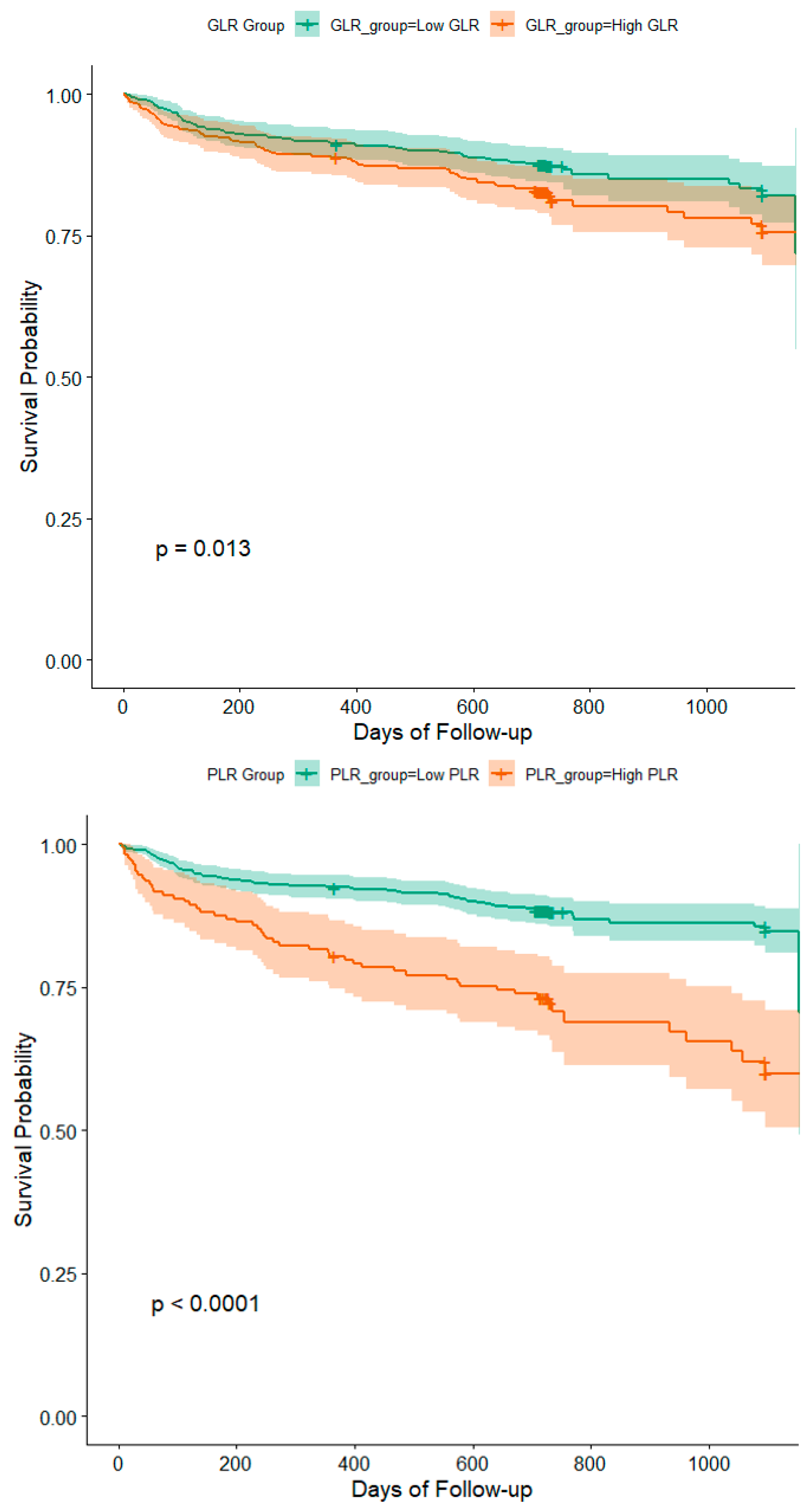 | Variable | Total Population (N = 853) | Elevated PLR (≥191.92) | Not-Elevated PLR (<191.92) | p-Value (PLR) | Elevated GLR (≥66.8) | Not-Elevated GLR (<66.8) | p-Value (GLR) |