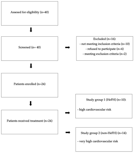 In study group 1, there were 10 patients (8 women, 2 men) diagnosed with HeFH (scoring at least 9 points according to DLCN) at high cardiovascular risk (HeFH without a history of cardiovascular events). In study group 2, there were 14 patients (5 women, 9 men) at very high cardiovascular risk with polygenic hypercholesterolemia (scoring less than 9 points according to DLCN) and a history of cardiovascular events. Figure 1 presents the study flow chart.