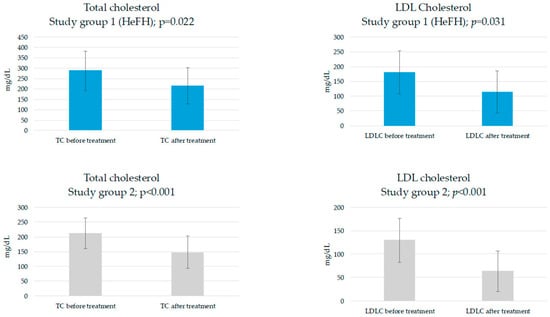 After 3 months of therapy, statistically significant reductions in TC level were observed (study group 1: from 287.6 ± 94.2 to 215.2 ± 89.1 (mg/dL), p = 0.022; study group 2: from 211.7 ± 52.7 to 147.6 ± 55.4 (mg/dL), p < 0.001) and LDL-c (study group 1: from 180.8 ± 73.3 to 114.7 ± 71.5 (mg/dL), p = 0.031; study group 2: from 129.6 ± 46.8 to 63.4 ± 43.6 (mg/dL), p < 0.001) (Figure 2). Nonetheless, the magnitude of reduction did not achieve statistical significance in either lipid parameters (study group 1: ΔTC = −72.4 ± 82.8 (mg/dL), study group 2: ΔTC = −64.1 ± 33.8 (mg/dL), p = 0.769; study group 1: ΔLDL-c = −66.1 ± 81.9 (mg/dL), study group 2: ΔLDL-c = −66.2 ± 27.1 (mg/dL), p = 0.997)). The target of LDL-c below 70 mg/dL for the patients with high cardiovascular risk in accordance with ESC guidelines was achieved in study group 1 by 10% of patients and in study group 2 by 42.9% of patients. Nevertheless, such difference was not statistically significant at p = 0.242. Furthermore, there were no significant changes concerning values of INR, APTT and MPV in either study groups.