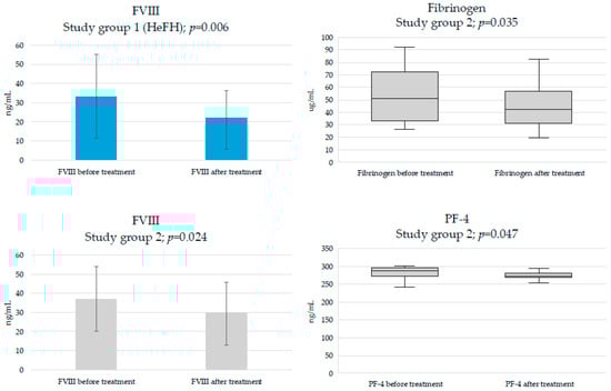 In the group of platelet activation markers, a significant decrease in PF-4 in study group 2 (from 286 (272–295.5) to 272 (268–281.5) (ng/mL), p = 0.047) was noted. The concentration of P-selectin was not statistically different in either of the groups. Figure 3 presents significant changes in the concentration of prothrombotic and platelet activation markers after the therapy with inclisiran.