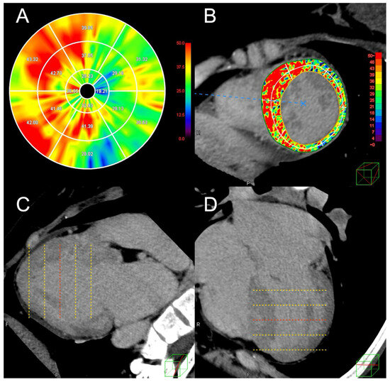 ECV of the LV myocardium was calculated using the formula ECV = (ΔHUm/ΔHUb)/(1 − Hct) with commercially available software (Ziostation 2, Ziosoft Inc, Japan). In this formula, ΔHUm indicates the change in myocardial CT attenuation (in Hounsfield units), ΔHUb the change in blood CT attenuation, and Hct the hematocrit [17]. An automatic three-dimensional non-rigid registration of the myocardium was performed between the non-contrast and late-phase CT images to generate subtraction images, facilitating ECV calculation. From these images, the change in CT attenuation (ΔHU) was measured [17,18]. A polar map illustrating the mean ECV value for each of the 16 American Heart Association LVM segments was generated (Figure 1A). LV-ECV measurements on CT were conducted by a board-certified cardiologist (Hi.T.) with 15 years of cardiac CT reading experience and another cardiologist (S.A.) with four years of experience. These observers also assessed for the presence of LIE of LVM on the same workstation, resolving any disagreements through a consensus reading. Sample images demonstrating the ECV analysis on CT are shown in Figure 1.