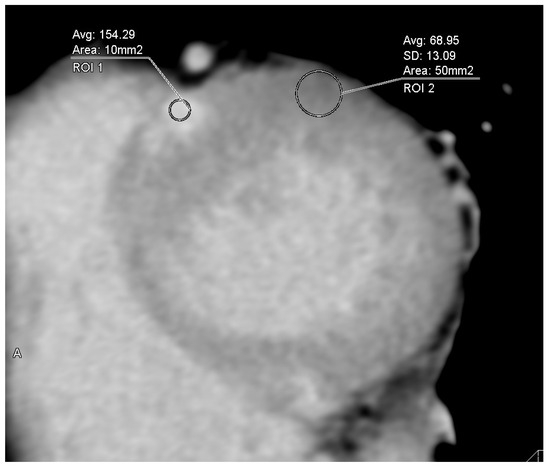 For quantitative image quality analysis, regions of interest were manually drawn, approximately 0.1 cm2 in areas of late iodine enhancement (LIE) and 0.5 cm2 in the remote myocardium, in cases where LIE of LVM was present on CT (Figure 2). The contrast-to-noise ratio (CNR), an indicator of image quality, was also quantified. CNR is obtained by dividing the difference in CT attenuation between the late enhancement area and the normal myocardium by the standard deviation (SD) of CT attenuation in normal myocardium [15,18]. CNR was evaluated in all 40 patients (80%) with LIE on CT (by S.A.).