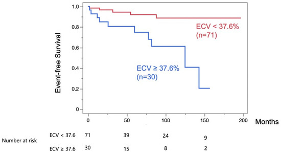 Kaplan–Meier curve of event-free survival. A significantly higher rate of major adverse cardiac events was observed in patients with left ventricular extracellular volume fraction (LV-ECV) ≥ 37.6% (n = 30) compared to patients with LV-ECV < 37.6% throughout the follow-up periods (p < 0.001).