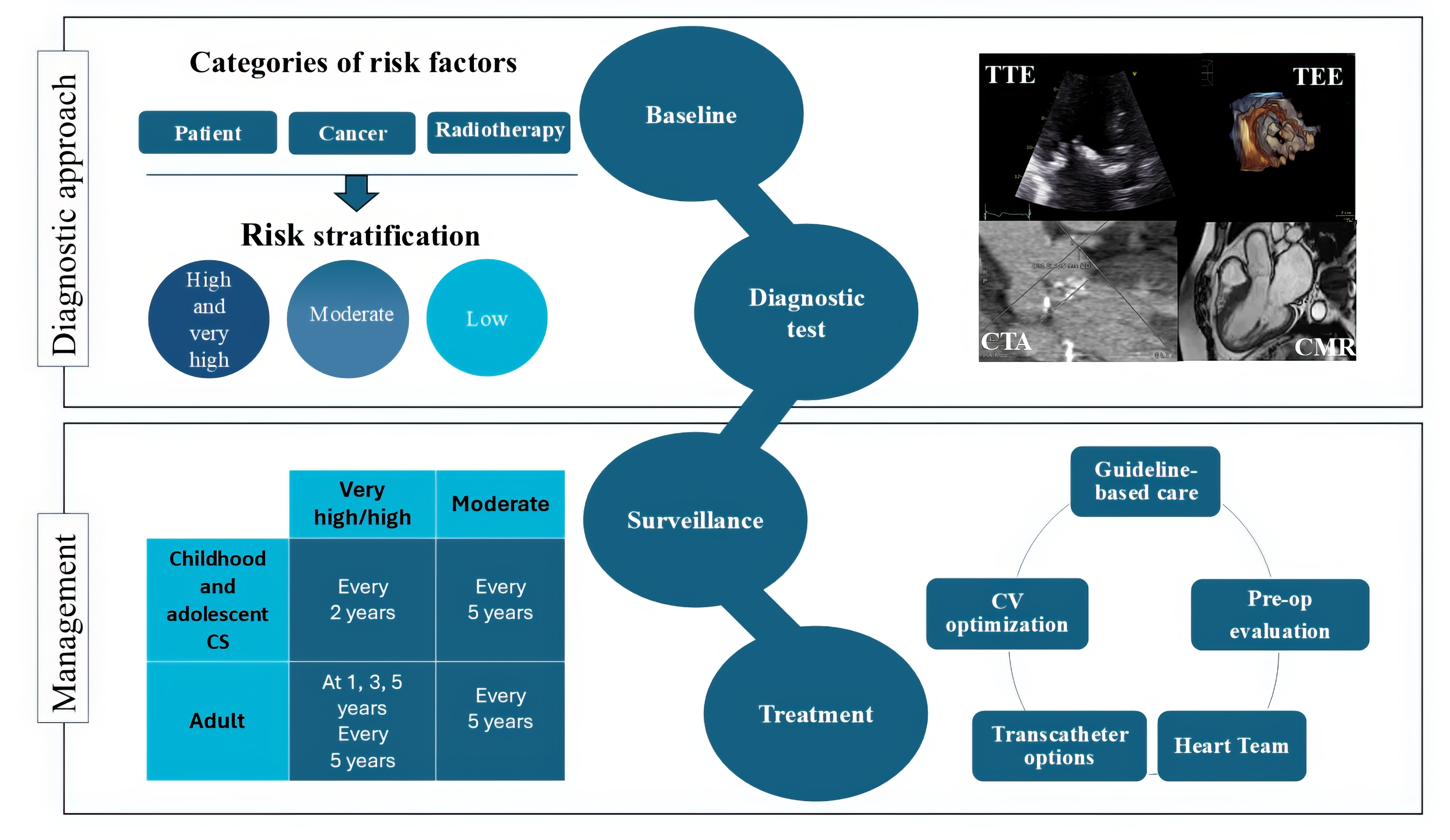| High | Mediastinal radiotherapy ≥ 30 Gy with the heart in the treatment field Lower dose radiotherapy (<30 Gy) with anthracycline exposure Patients aged <50 years and longer time since RT High dose of radiation fractions (>2 Gy/d) Presence and extent of tumor in or next to the heart Presence of CV risk factors Pre-existing CV disease |