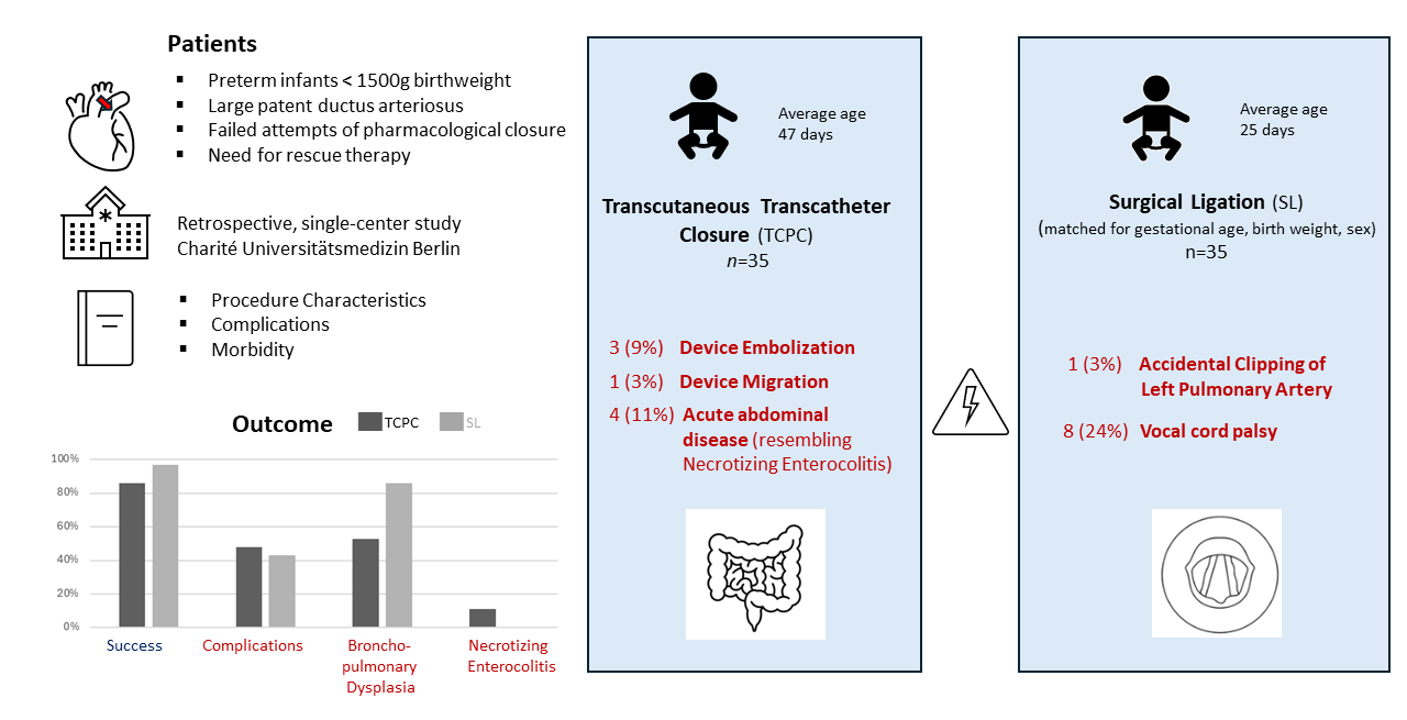 - Chock, V.Y.; Bhombal, S.; Davis, A.S.; Sankar, M.N.; Do, B.T.; Laughon, M.M.; Van Meurs, K.P.; Backes, C.H.; McNamara, P.J. Respiratory Outcomes After Transcatheter vs Surgical Patent Ductus Arteriosus Closure in Preterm Infants. JAMA Netw. Open 2025, 8, e2513366. [Google Scholar] [CrossRef]